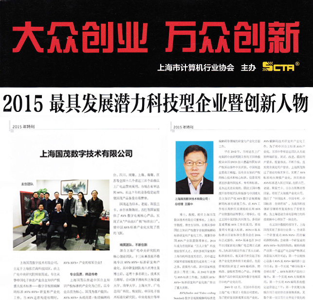 上海國茂數字技術有限公司在此次大會上被授予“2015最具發展潛力科技型企業”,同時公司董事長王國中博士獲得2015年度上海市計算機行業創新人物”榮譽稱號。并在計算機行業協會特刊大篇幅著重介紹。