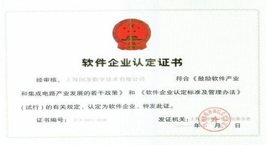經(jīng)過專家評(píng)審、網(wǎng)上公示,上海國茂數(shù)字技術(shù)有限公司獲得上海市經(jīng)濟(jì)和信息化委員會(huì)頒發(fā)的"軟件企業(yè)認(rèn)定證書",證書編號(hào):滬R-2011-0096.
